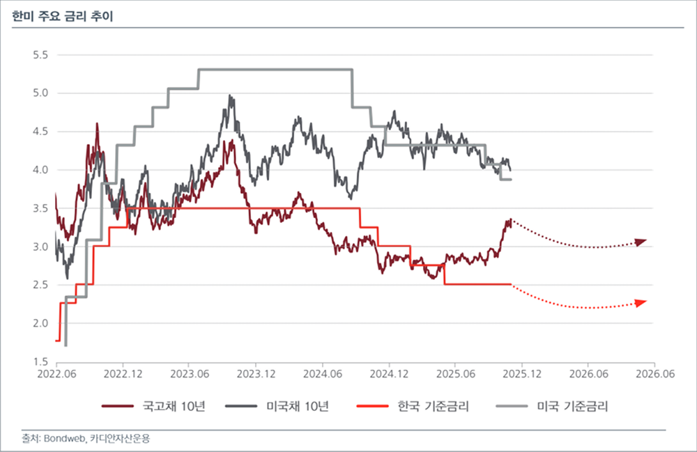 또한 내년 지방선거를 앞두고 정부가 추가적인 부동산 안정 대책을 마련할 경우 한국은행의 금융안정 중심 스탠스가 완화될 여지도 있으며, 이는 연초 기준금리 인하 기대 재형성 → 1분기 강세 출발의 흐름을 뒷받침할 것으로 보입니다. 더불어 4분기 급등으로 인해 높아진 금리 레벨은 상대가치 매수 대기 수요 유입이라는 또 다른 강세 요인으로 작용할 가능성이 있습니다.